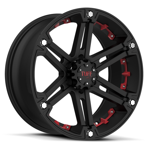Tuff T-01 Rims with Flat Black with Red Inserts Finish are a beautiful 6 spoke rims with a strong structural design. The Tuff T-01 line comes with 15 X 8, 16 X 8, 17 X 8, 18 X 9, 20 X 9, 22 X 9.5 sizes and may come with other available finishes, Tuff models or styles.